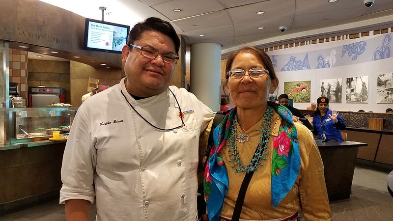 Navajo Family Voices Family Circle Director Kyle Jim used all local farmer produced corn, squash and beans in an all day food demo at the farmers market, feeding and signing up Shiprock families for the Food Hub.