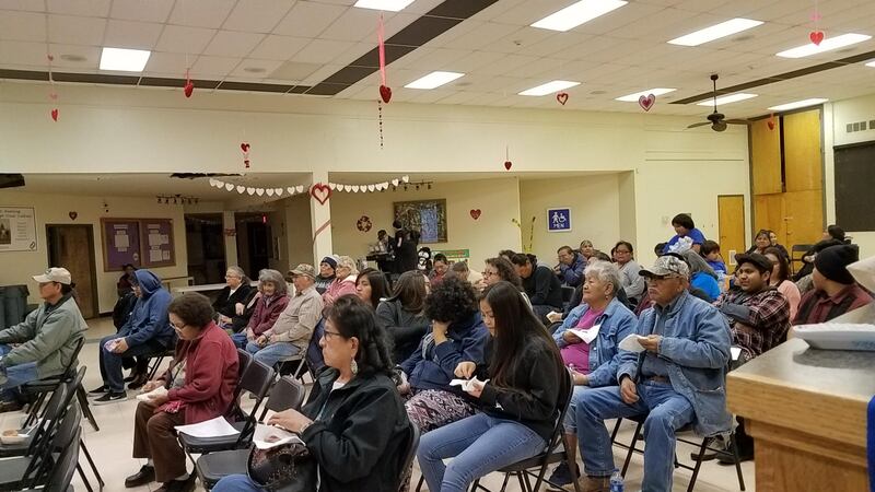 Traditional teacher Ray Deal answered questions posed by young family leaders Kyle Jim and Megan Johnson concerning winter stories about children with extra healthcare needs. Ray unfolded the stories to track clan and parental responsibilities as the children age, and how siblings relate especially in illness. He noted how all were by chance from Taachini clan. He did not avoid talking about darkness as well as beauty and happiness, hozho, and he spoke of Changing Woman and mountain animals. One parent stood up to say she came especially to be instructed on their own children, hearing of the event on KTNN. Bertha, a traditional farmer, was moved by the inclusion and questions of young family leaders. Participants were from all ages. Fruit topped blue mush cookies made by Kyle was presented to Ray and given to everyone. Happy Birthday was sung to Sophie, Karen John's daughter, and her cake was also shared after a good potluck. It was a very happy evening for all.