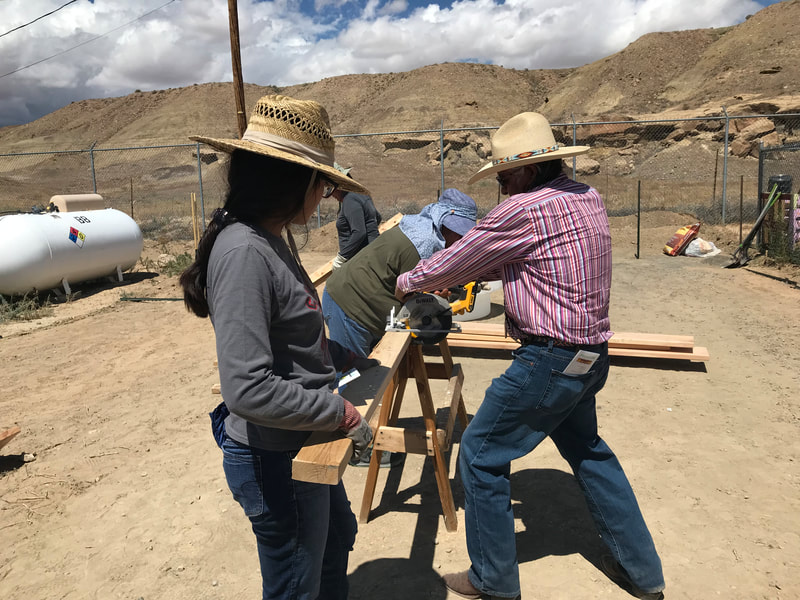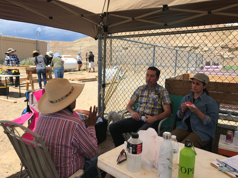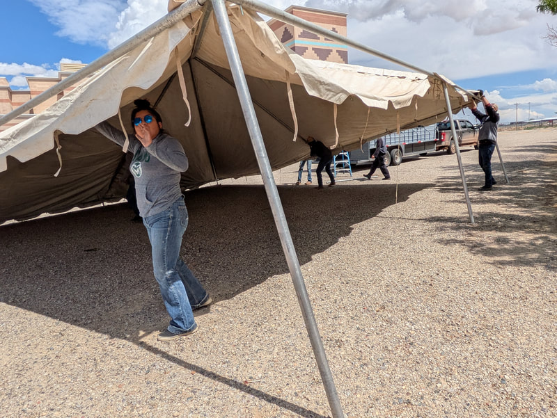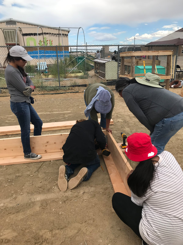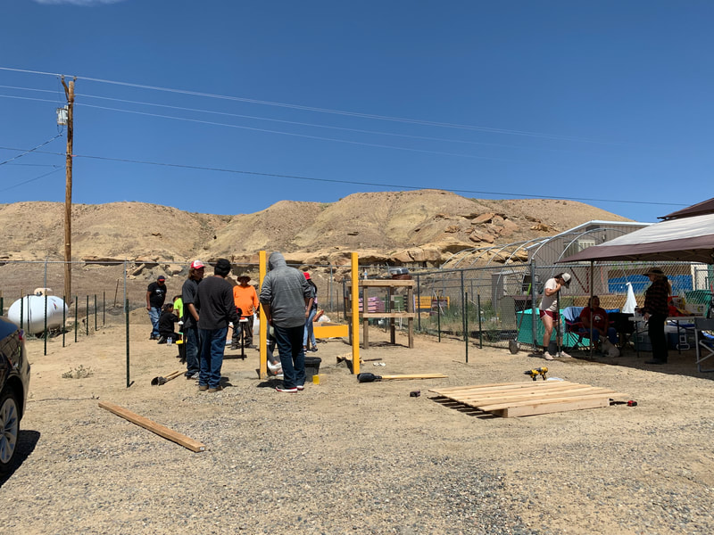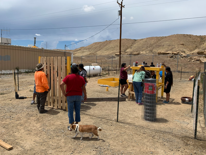 Alongside parents, grandparents, CYSHCN students and other students, school staff and members of the Newcomb community, Hazel and Megan helped assemble the water tower, gate, and garden beds and set up the food area to feed almost 30 participants each day with San Juan Collaborative for Health Equity, Newcomb Chapter, COPE from Gallup, DCRE, Iina Baa Hozho, and the McCune Charitable Foundation. Iina Baa Hozho spearheaded gardening using traditional methods and knowledge two years ago in support of Newcomb child wellness following a wellness crisis among the community's school-age children.